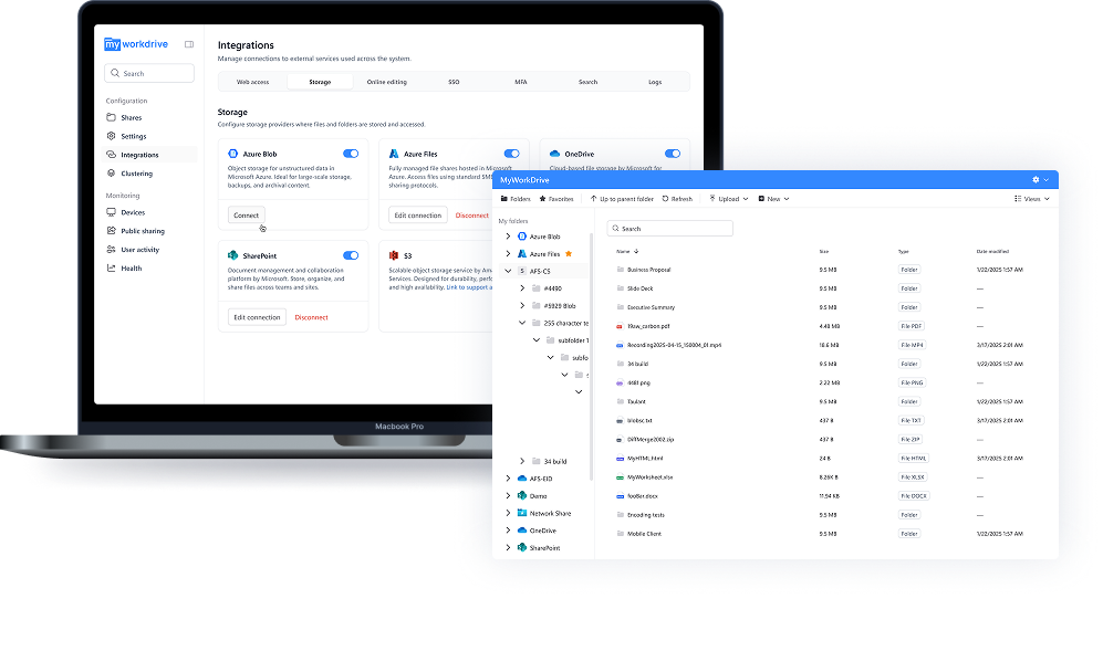 Provide remote access to SMB shares, Azure Files, OneDrive, SharePoint, or S3 using our browser-based File Manager, Drive client, or mobile apps while enforcing your existing NTFS permissions.