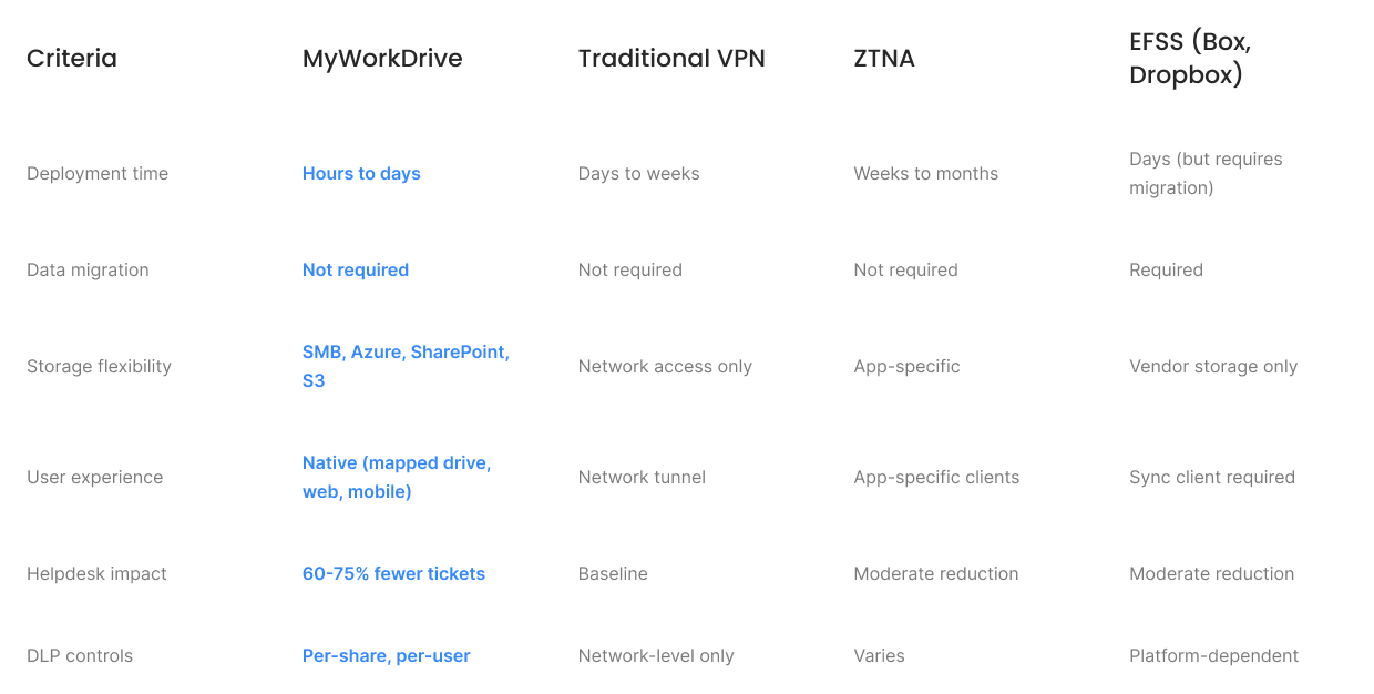 No agents. No VPN tunnels. No attack surface. MyWorkDrive delivers secure HTTPS access with granular permissions, SSO, and full audit logging—without ever exposing your internal network.