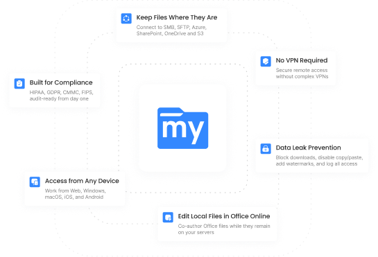 Meet HIPAA, GDPR, CMMC, FIPS, and FEDRAMP requirements with ease. Enforce enterprise SSO and MFA while maintaining complete visibility and auditability across your file environment.
