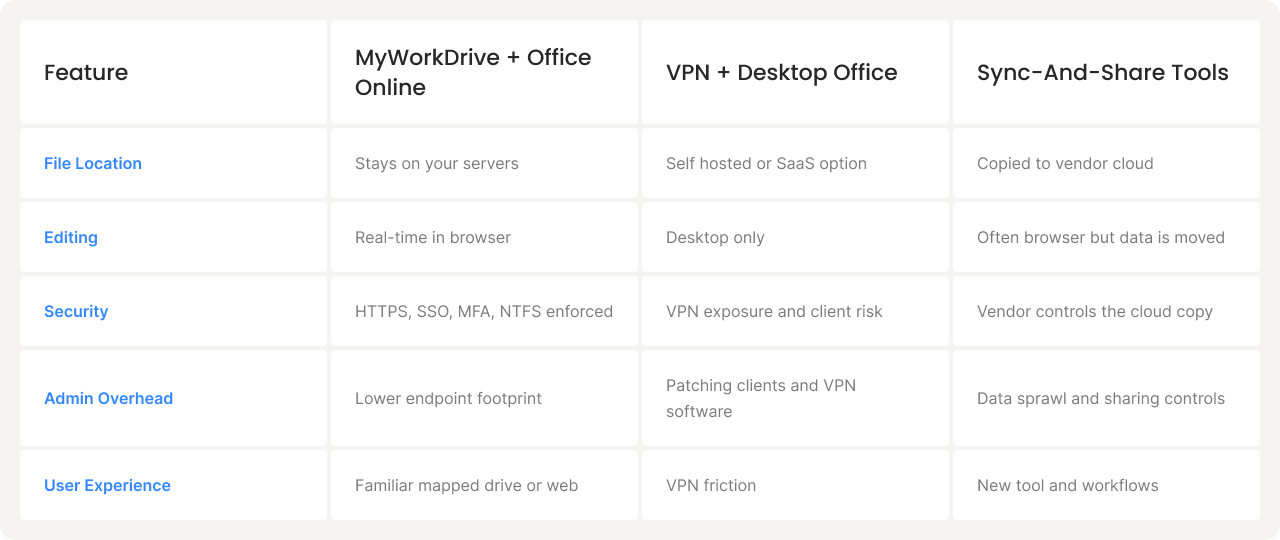 If you want an alternative or a mixed environment, MyWorkDrive also supports OnlyOffice for browser-based editing and coauthoring while files stay on your storage. Same security model, same user experience.