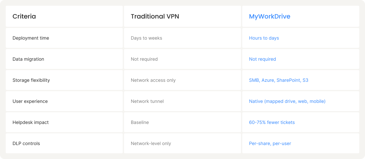 Users log in with existing credentials via web browser, mapped drive, or mobile app. No VPN. No training required.